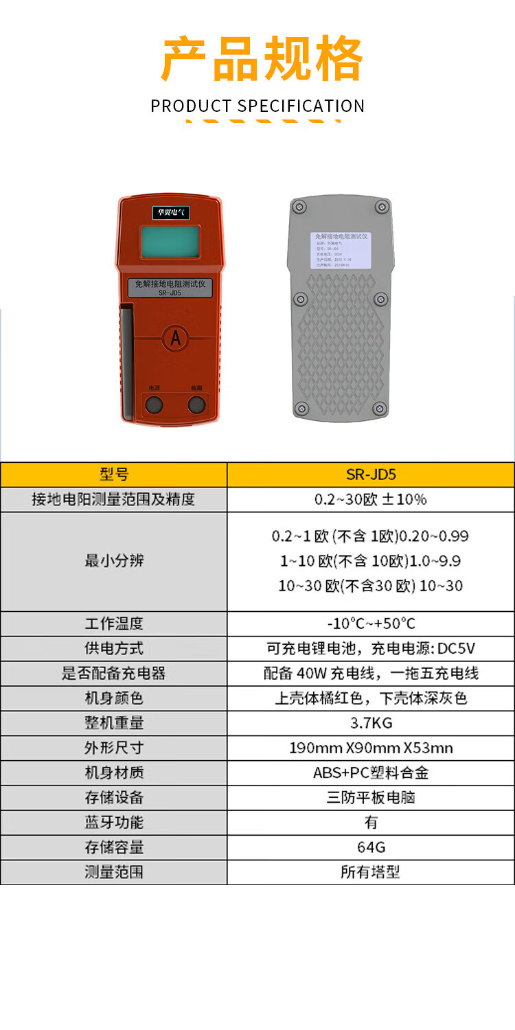 商品名称:【精选】华翼电气 SR-JD5 免解接地电阻测试仪 单位:台