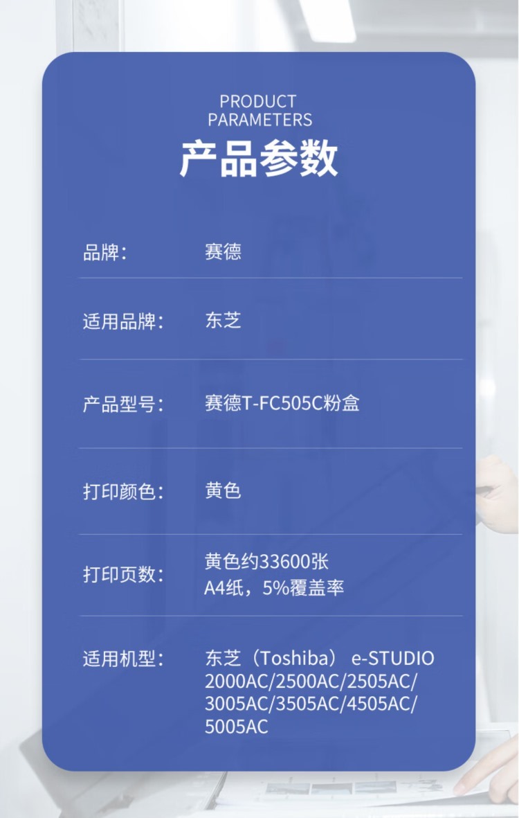 商品名称:【精选】赛德 T-FC505C 粉盒 大容量 适用东芝Toshiba 2000AC 2500AC 2505AC 黄色(单位:支)