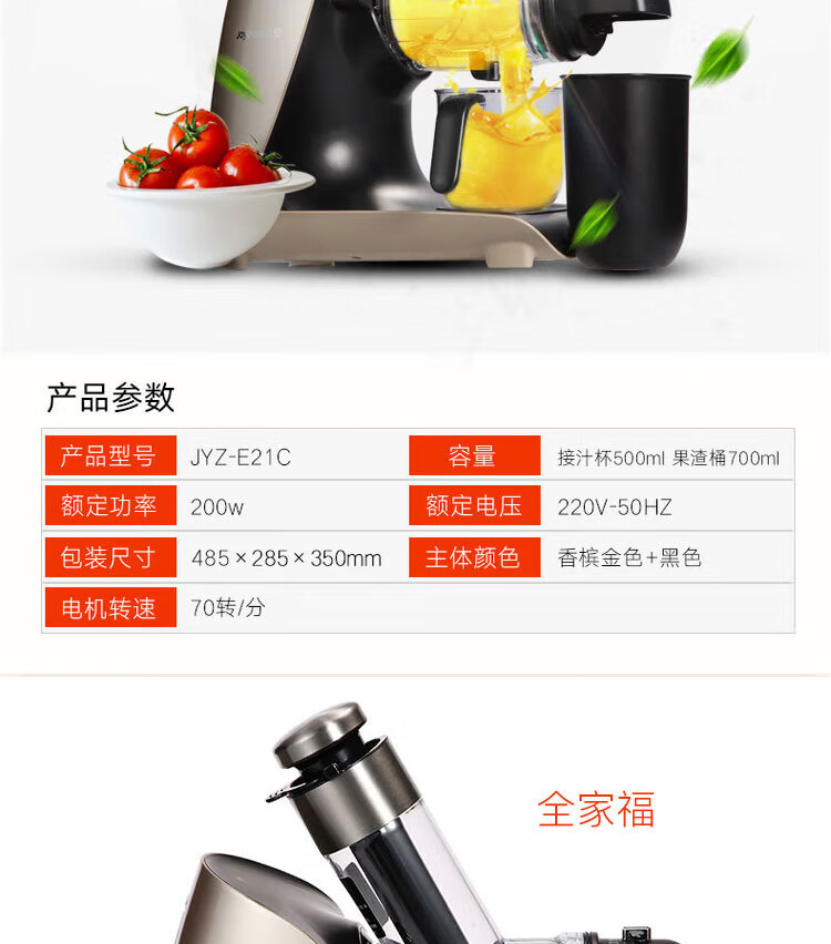 商品名称:【精选】九阳 JYZ-E21C 大口径渣汁分离电动卧式果汁机 原汁机三档(单位:台)