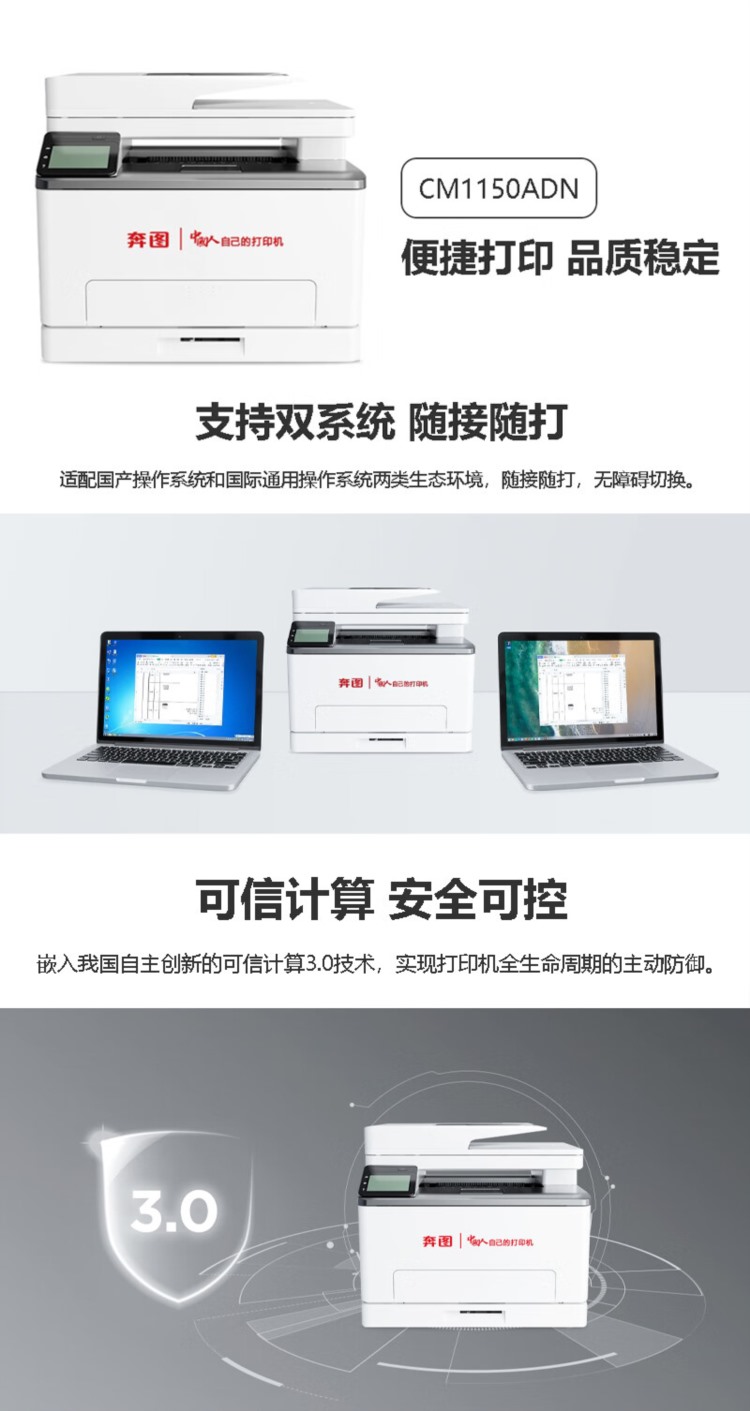 商品名称:【精选】奔图(PANTUM)(GBHX)CM1150ADN激光多功能一体机 A4彩色自动双面 401*411*358mm 单位:台