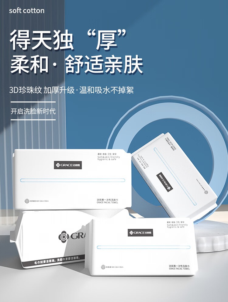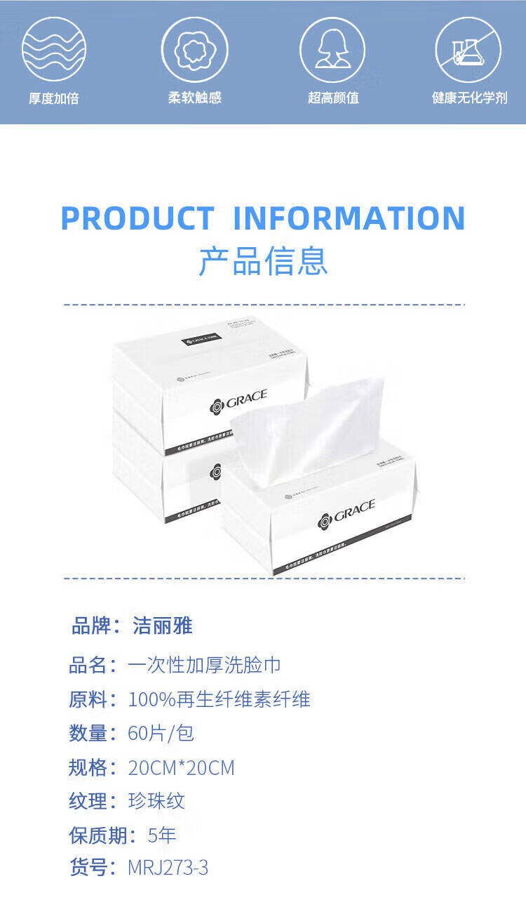 商品名称:【精选】洁丽雅(Grace)一次性洗脸巾女加厚化妆洁面棉柔巾3D珍珠纹擦脸巾3连包 20*20cm 60抽/包