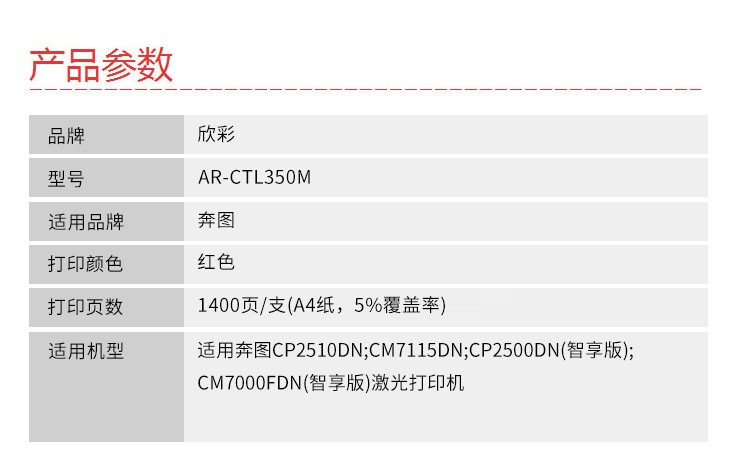 商品名称:【精选】欣彩 AR-CTL350M 红色粉盒 适用奔图CTL-350M CP2510DN CM7115DN CP2500DN(智享版) CM7000FDN(智享版) 激光打印机(单位:个)