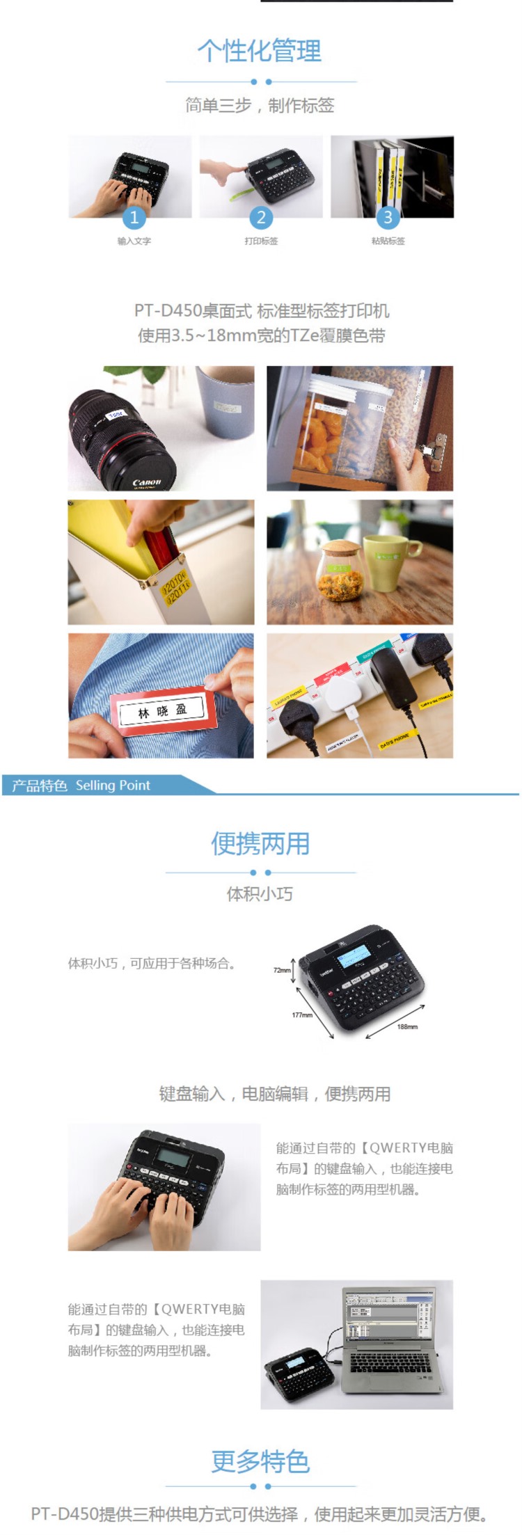 商品名称:【精选】兄弟 PT-D450 打印宽度3.5-18mm 打印速度20mm/s 精度180dpi 热转印 标签打印机 (计价单位:台)黑色