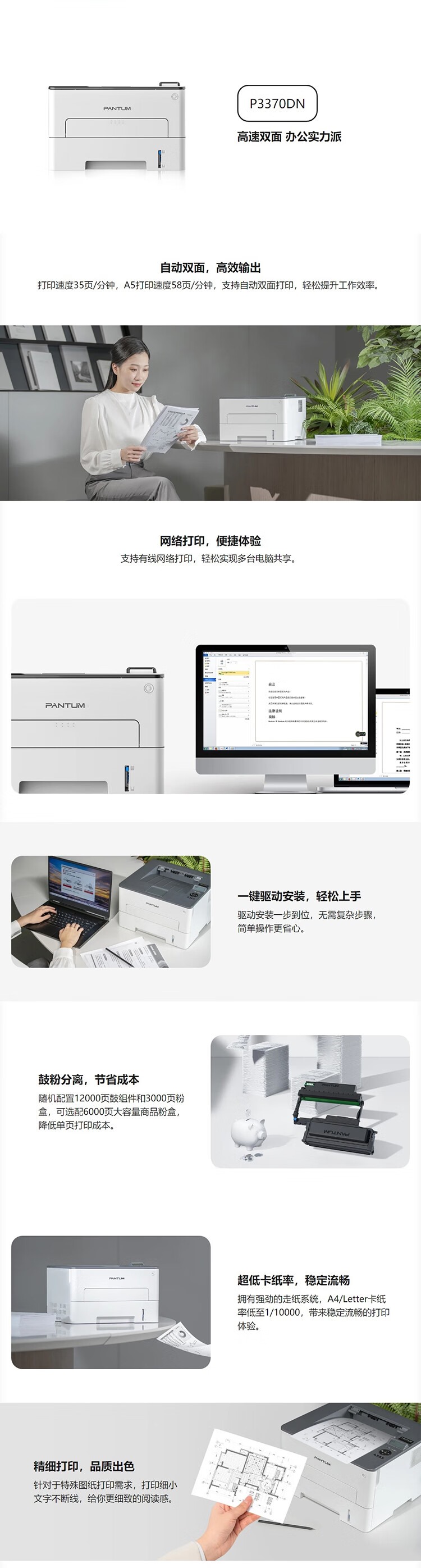 商品名称:【精选】奔图 黑白激光打印机 P3370DN A4幅面 自动双面