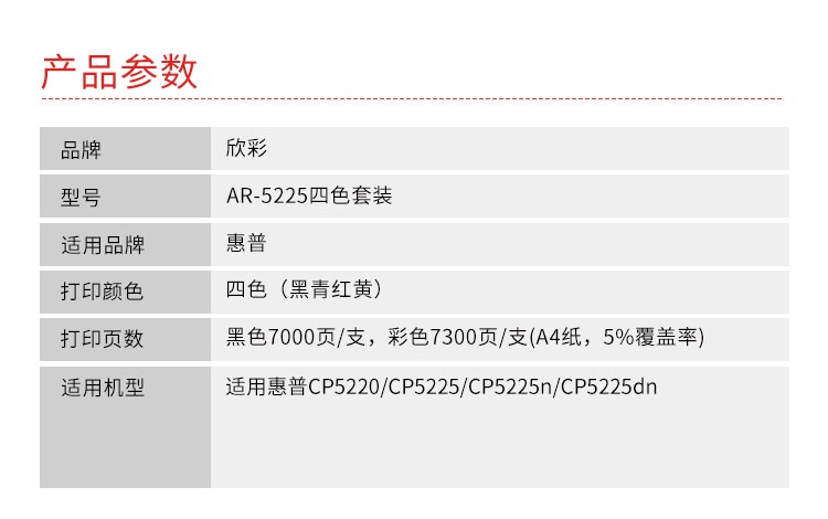 商品名称:【精选】欣彩 AR-5225 四色彩鼓套装 适用机型:适用惠普CP5220/CP5225/CP5225n/CP5225dn 打印页数:黑色7000页,彩色7300页(单位:套)