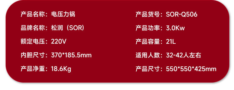 商品名称:【精选】松润SOR-Q501 765*380*435 8L电压力锅紫色(单位:台)