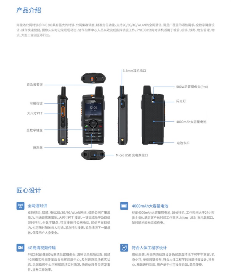 商品名称:【精选】海能达(Hytera)PNC380 (Pro) (GBAKD)Hytalk公网平台 全网通对讲机 后置500W 4G音视频对讲