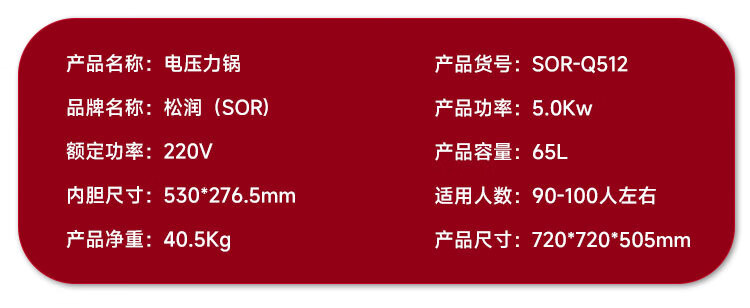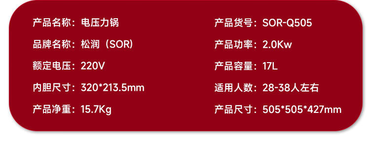商品名称:【精选】松润SOR-Q507 530*530*520 25L电压力锅银色(单位:台)
