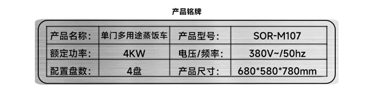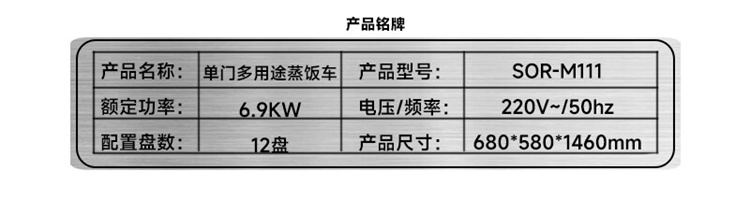 商品名称:【精选】松润SOR-M108 680*580*950 6盘单门蒸饭柜银色(单位:台)