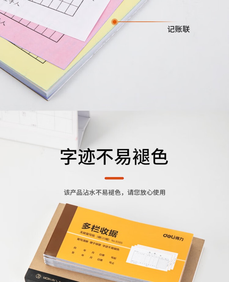 商品名称:【精选】得力(deli) 9385 175*87mm 三联 多栏收据单 20组 收据单 (计价单位:本) 黄色