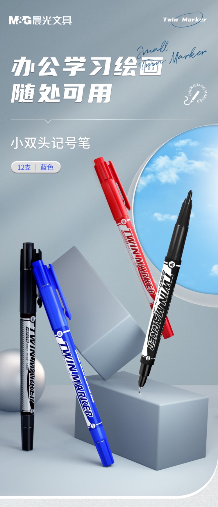 商品名称:【精选】晨光 M&G 美新小双头记号笔 XPMV7403 细头1.0mm,极细头0.5mm (蓝色) 12支/盒