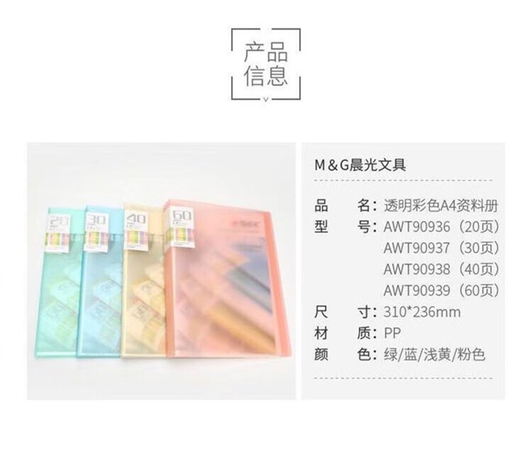 商品名称:【精选】晨光 M&G 彩色资料册 AWT90938 A4 40页 (红色、蓝色、黄色、绿色、白色) (颜色随机)