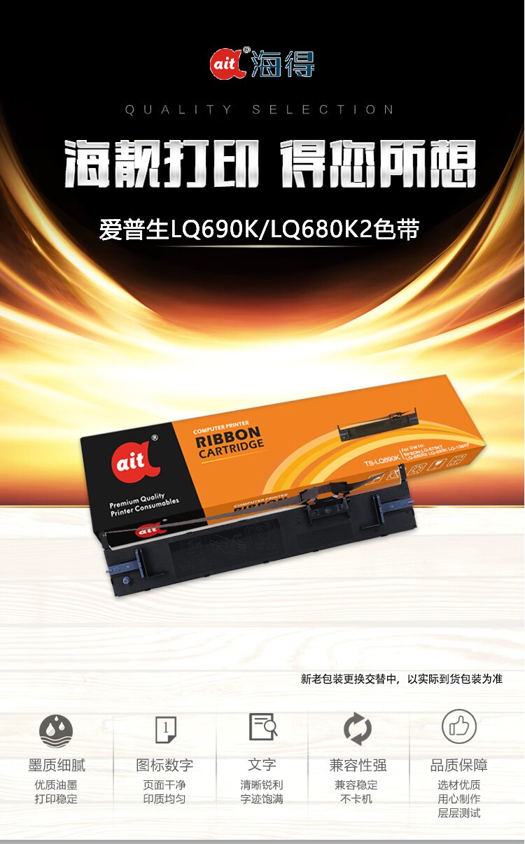商品名称:【精选】海得(Ait) LQ690K 色带 含色带芯 适用机型:爱普生LQ680Kii LQ675KT LQ695C LQ106KF LQ690C 12.7mm*30m 右扭 黑色 单位:盒
