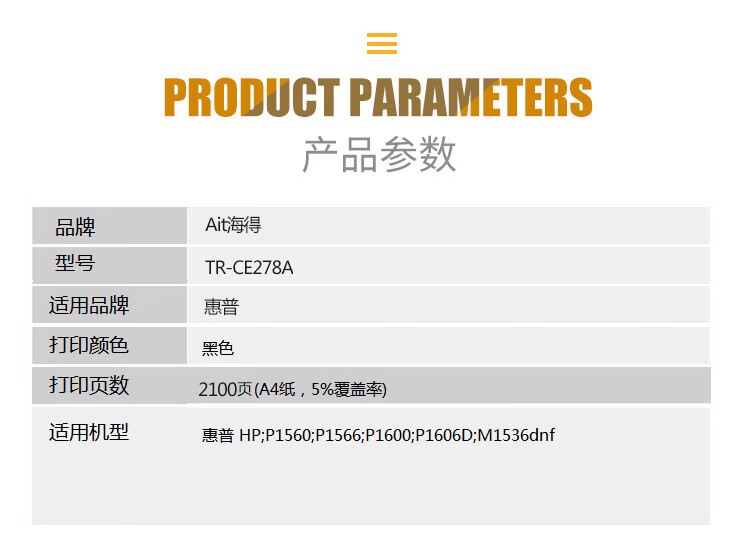 商品名称:【精选】海得(Ait) AIT-CE278A 硒鼓 易加粉 适用机型:惠普HP278A 78A P1606dnf M1536dnf P1566打印机 打印页数:2100页 单位:盒