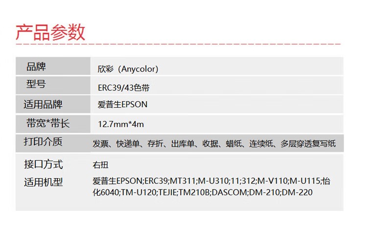 商品名称:【精选】欣彩 色带 ERC39/43 (黑色 )含带芯 适用爱普生MT311 MU310 MU115 MV110 TMU120 TM210B DM210 220