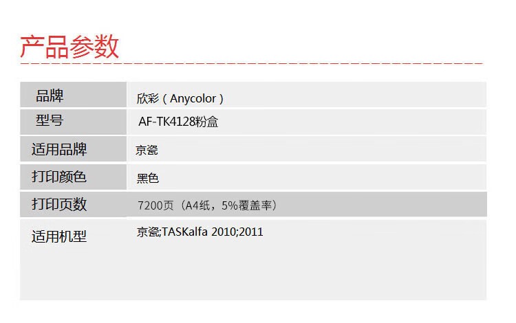 商品名称:【精选】欣彩 AF-TK4128 墨粉盒 专业版 适用机型:京瓷;TASKalfa 2010;2011;2211 打印页数:7200页 单位:支