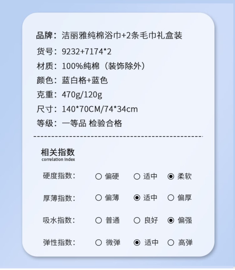 商品名称:【精选】洁丽雅 9232 毛巾 毛巾*2+浴巾*1 (计价单位:组) 470g/120g蓝色