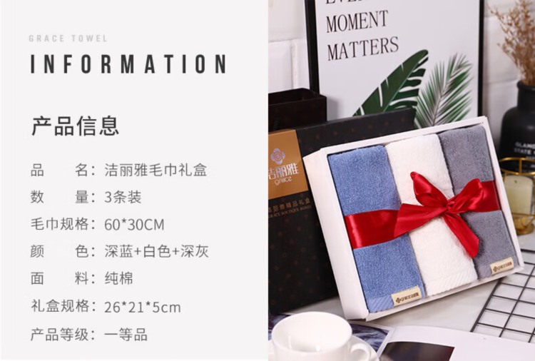 商品名称:【精选】洁丽雅 W0355 规格:34*72cm 100g 毛巾 (计价单位:盒) 材质:100棉 3条礼盒套装/无手提袋
