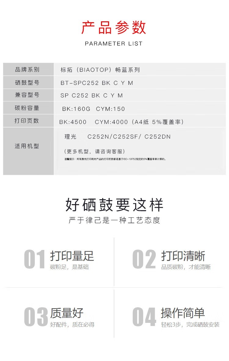 商品名称:【精选】标拓 打印机硒鼓 BT-SP C252 Y 适用理光C252N/C252SF/C252DN打印机 打印量4000页 畅蓝系列 (计价单位:支) 黄色