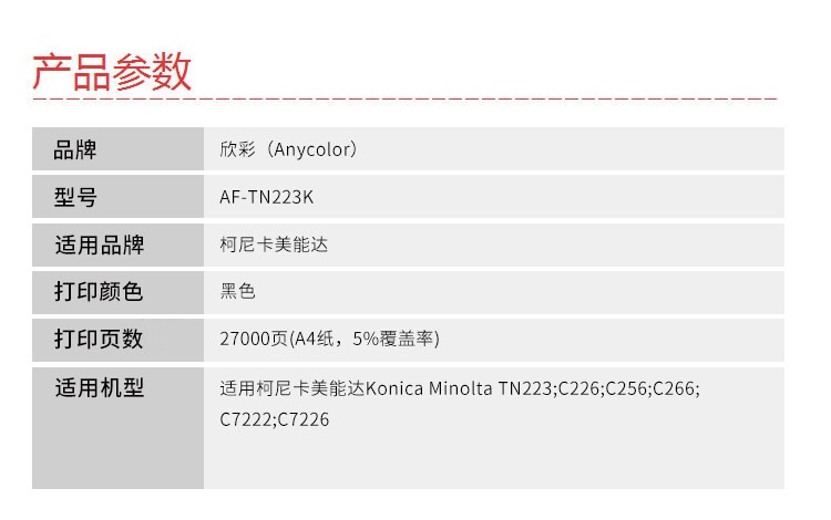 商品名称:【精选】欣彩(Anycolor) TN223粉盒 专业版 AF-TN223K黑色 适用柯尼卡美能达Konica Minolta c226 256 66 7222 7226复印机粉筒