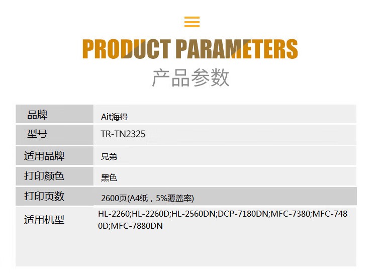 商品名称:【精选】海得(Ait) 粉盒 TR-TN2325 大众版 适用兄弟MFC7380粉盒7880DN硒鼓DCP7080D 7180DN打印机HL2260 打印量2600张 黑色