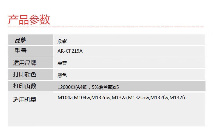 商品名称:【精选】欣彩 鼓架 AR-CF219A (黑色 )商务版 5支装含芯片 适用惠普HP M132snw M128fp M126nw M104a