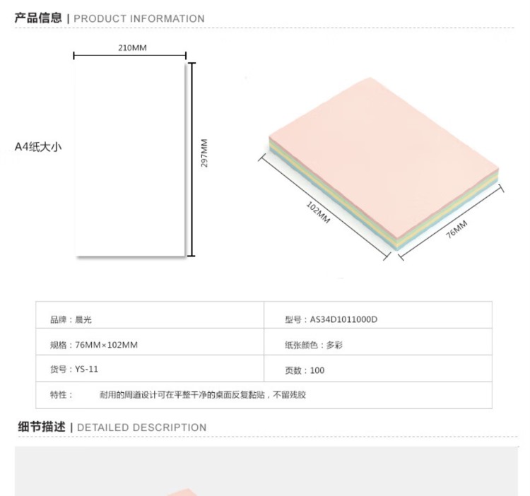 商品名称:【精选】晨光 M&G 优事贴多彩自粘便条纸 AS34D1011000D YS-11 3”*4” 76*102mm (黄色、绿色、蓝色、粉红) 100页/本 20本/盒