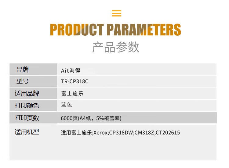 商品名称:【精选】海得(Ait) AIT-CP318C 粉盒 业版 适用机型:施乐 CP318DW CM318Z CT202615 打印页数:6000页 蓝色 单位:盒