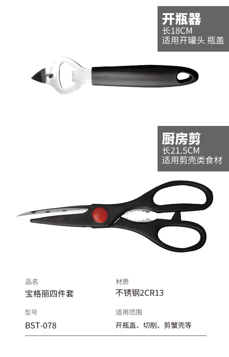 商品名称:【精选】栢士德 BST-078 万能剪+水果刀+多功能开瓶器+瓜果刨 宝格丽四件套 不锈钢本色单位:套