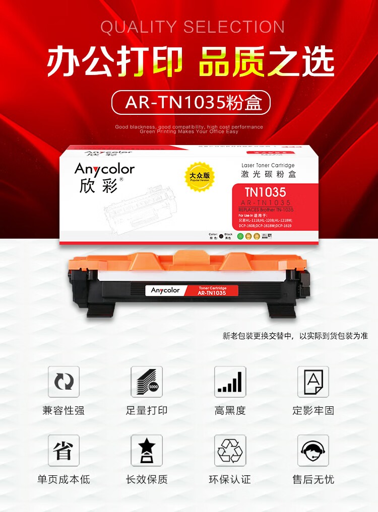 商品名称:【精选】欣彩(Anycolor)TN-1035粉盒 大众版 AR-TN1035墨粉盒 适用兄弟HL1118 1218W DCP1618 1518 MFC1813 HL-1208