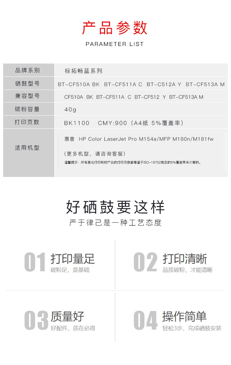 商品名称:【精选】标拓 打印机硒鼓 BT-CF512A 适用于M154A/nw/M180N M181FW打印机 打印量900页 蓝包系列 (计价单位:支) 黄色
