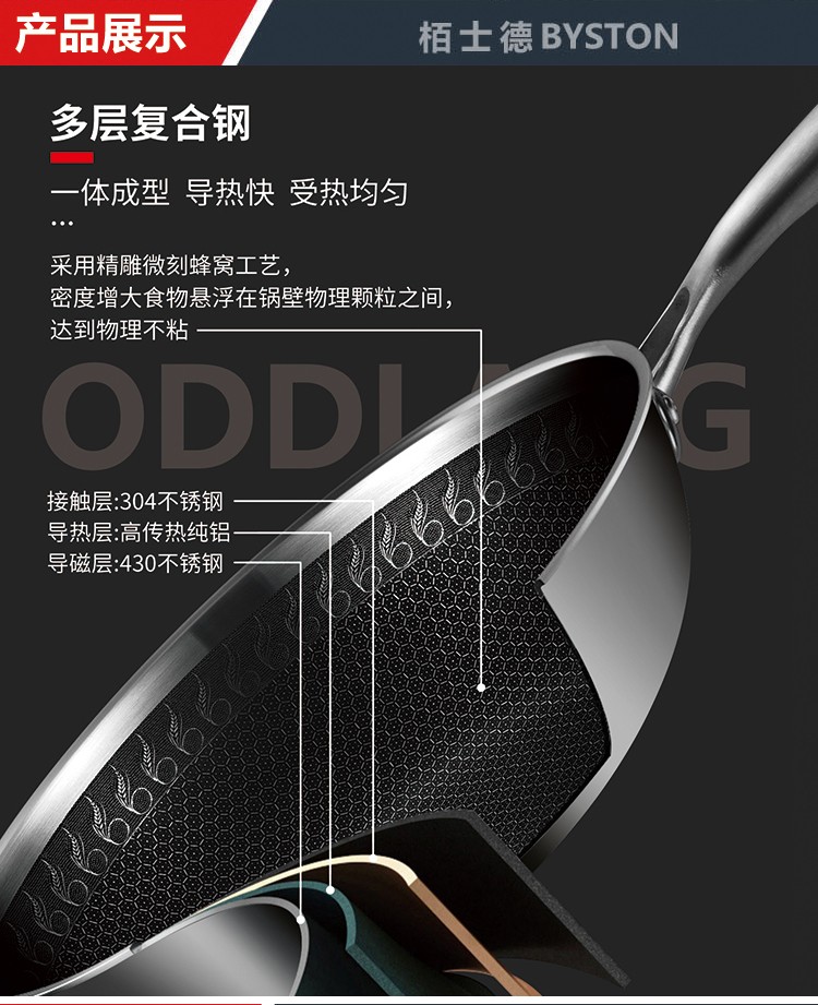 商品名称:【精选】栢士德BYSTON 奥德劳格蜂窝炒锅 BST-117 304钢铝钢三层钢 32CM(单位:套)