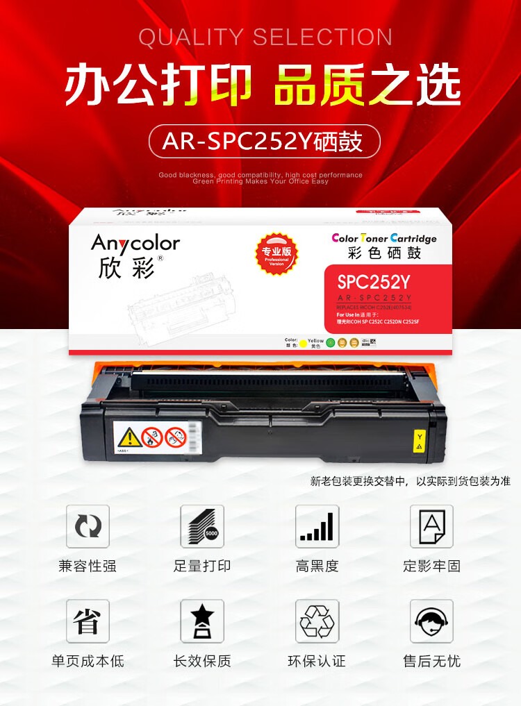 商品名称:【精选】欣彩 AR-C252Y 粉盒专业版 适用于:理光RICOH SP C252C C252DN C252SF 打印页数:4000页(计价单位:支)黄色