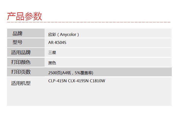 商品名称:【精选】欣彩 AR-K504S 粉盒专业版 适用于:三星硒鼓 CLP-415N CLX-4195N 4195FN 打印页数:2500页(计价单位:个)黑色 黑色 AR-K504S