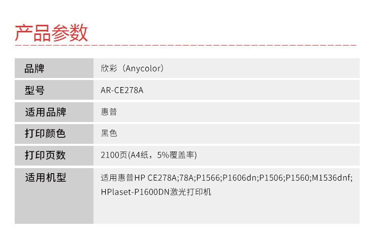 商品名称:【精选】欣彩 CE278A硒鼓(专业版)适用惠普HP278A 78A P1606dnf M1536dnf P1566打印机 AR-CE278A