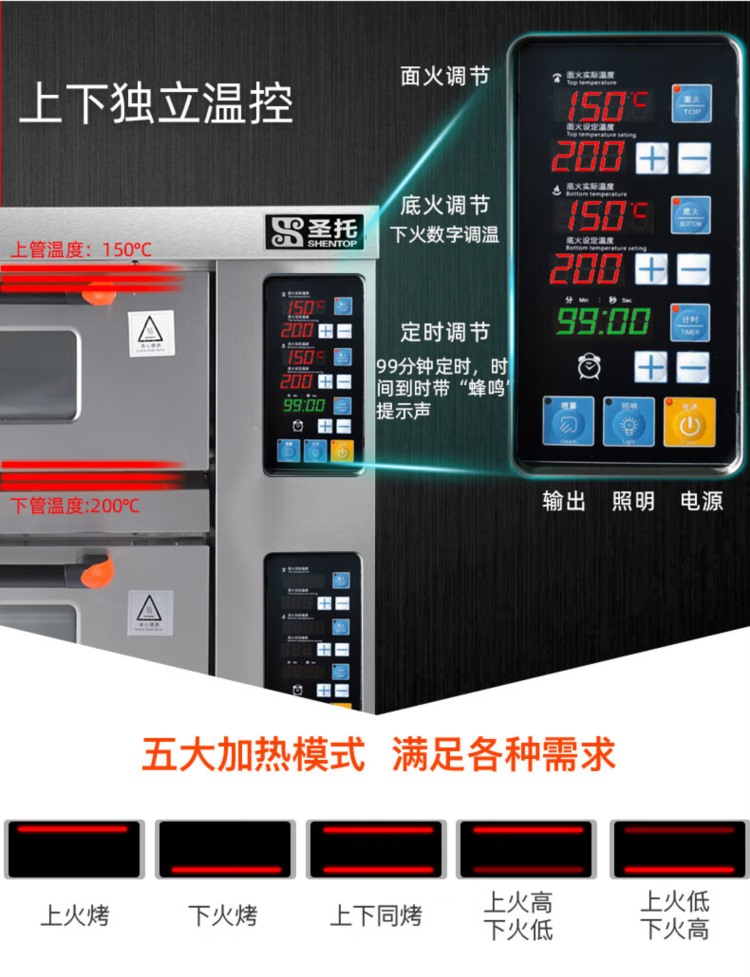 【精选】圣托 电烤箱 STAH-KD12 操控方式:按键式 容量:188L 一层二盘 功率:6.6KW 电源:220V 温度范围:常温-400℃ 尺寸:1220*830*510mm 内堂尺寸:870*640*220mm 定时:99分钟