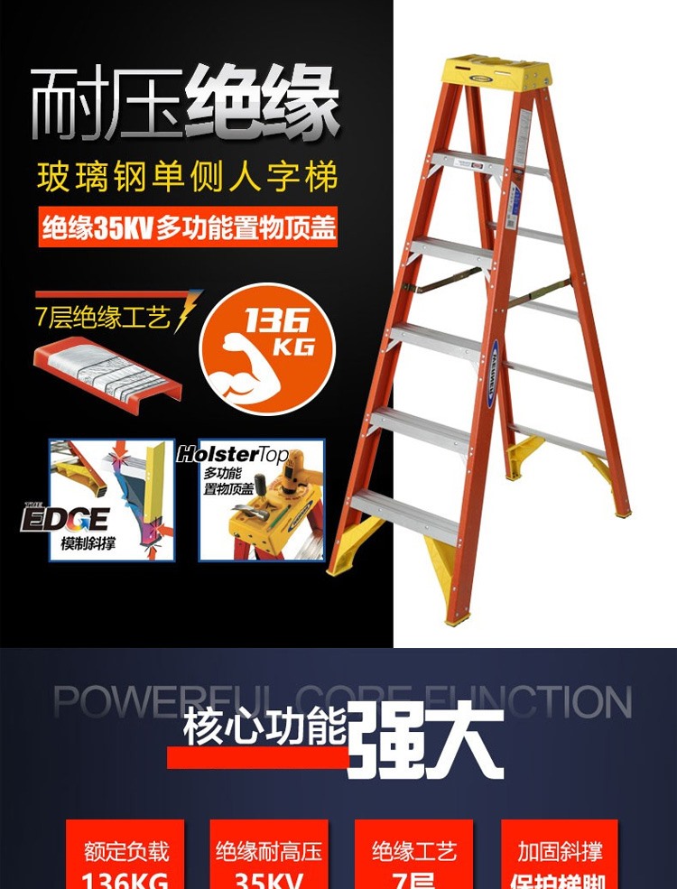 商品名称:【精选】稳耐(GBHX) 9步玻璃钢单侧人字梯 梯长2.7米型号6209CN承重136kg