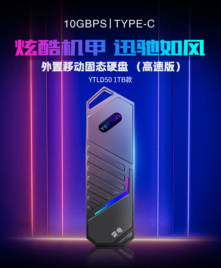 商品名称:【精选】盈通(yeston) 雷电 YTLD50 外置移动固态硬盘 (高速版) 1TB 单位:(个):颜色分类:RGB灯效