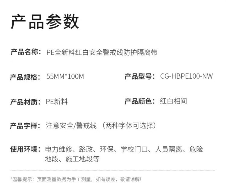 商品名称:【精选】诚格(C&G) PE全新料红白安全警戒线防护隔离带100m 电力维修 路政 环保 CG-HBPE100-NW