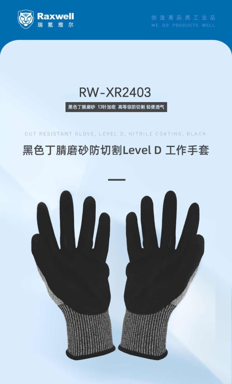 商品名称:【精选】Raxwell RW-XR2403 黑色丁腈磨砂防切割Level D工作手套 掌浸 XL 1副/袋 (计价单位:袋) 黑色