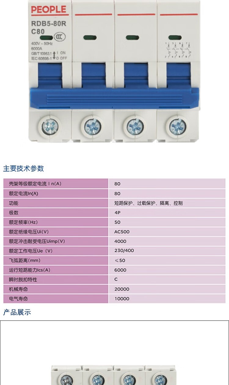 商品名称:【精选】人民电器 RDB5-80R 断路器 C80 4P (计价单位:个)