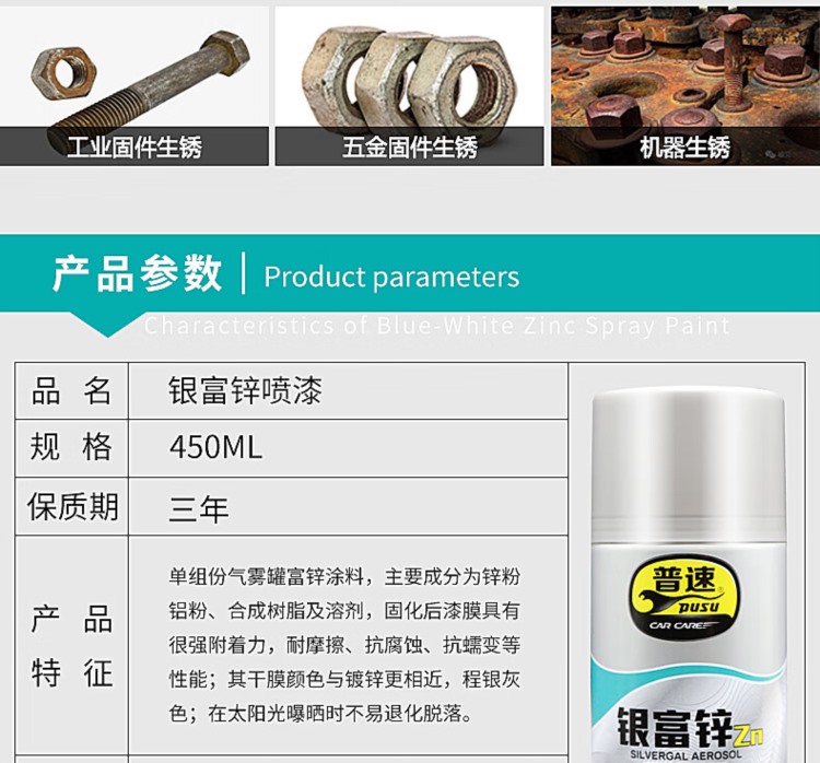 商品名称:【精选】普速 银富锌喷漆整箱 450ml*12瓶 PUSU4508 自喷修补漆防腐装饰喷漆防锈漆手摇