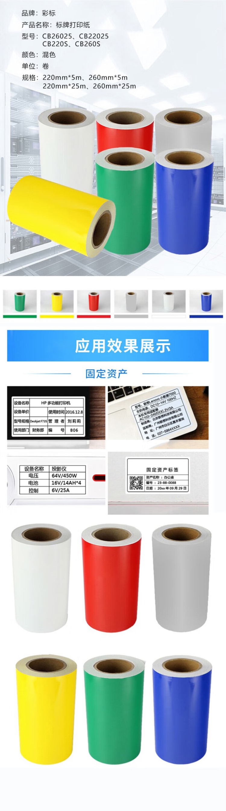 商品名称:【精选】彩标 标牌打印纸 标签纸 CB220S 220MM*5M (混色)