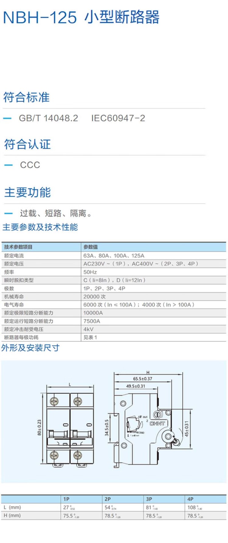 商品名称:【精选】正泰 NBH-125 2P C100A 断路器 (计价单位:个) 微型断路器