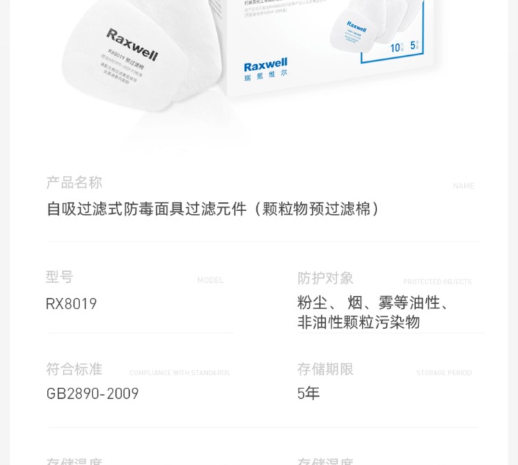 商品名称:【精选】瑞氪维尔/RAXWELL RX8019 过滤棉 P2级预过滤棉 10片/袋