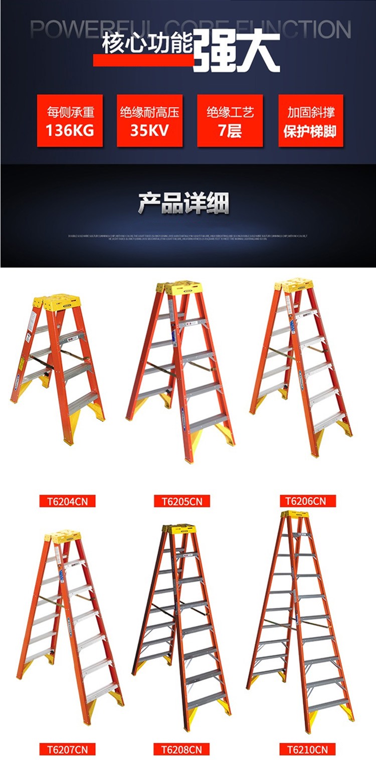 商品名称:【精选】稳耐(GBHX) 6步玻璃钢双侧人字梯 梯长1.8米型号T6206CN承重136kg