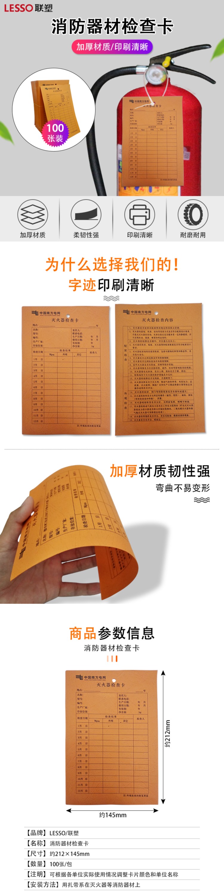 商品名称:【精选】联塑 消防器材检查卡 JCK-01 145mm*212mm 100张/包