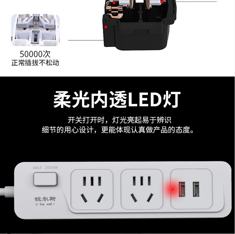 商品名称:【精选】锐尔斯 RH-7300U 三位分控开关延长线插座(带2个USB口5V 2.4A充电)全长1.8米 瓷白色(计价单位:个)