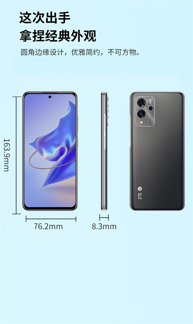 商品名称:【精选】ZTE中兴 V70 全网通5G手机 30W快充 内存8G+256G 6400万像素 云灰(单位:台)