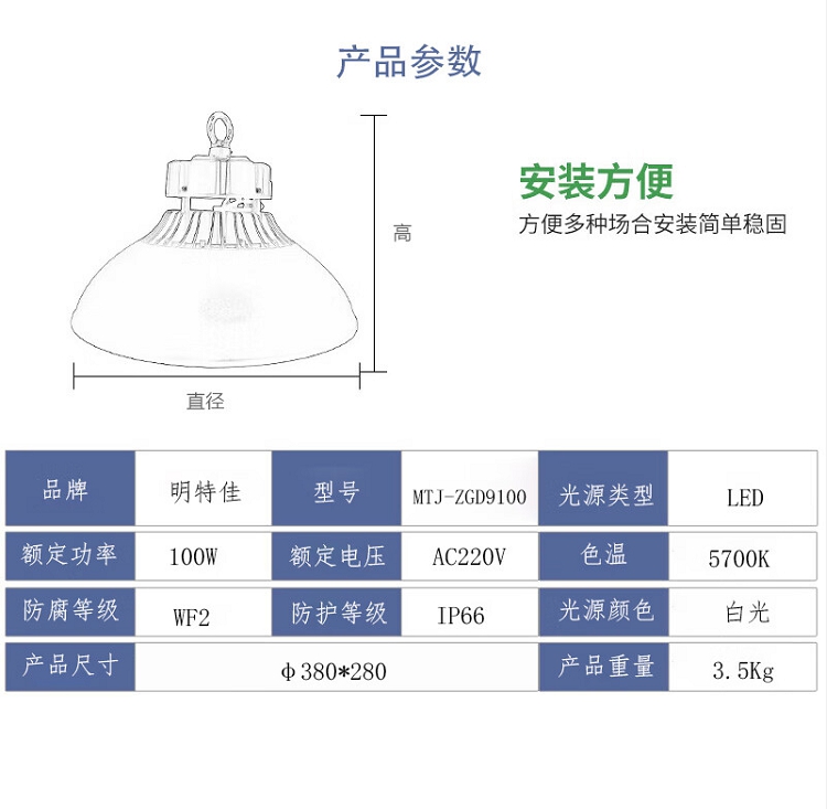 商品名称:【精选】明特佳 MTJ-ZGD9100 LED高顶灯 100W、IP66、AC220V、5700K 灰色 (单位:套)